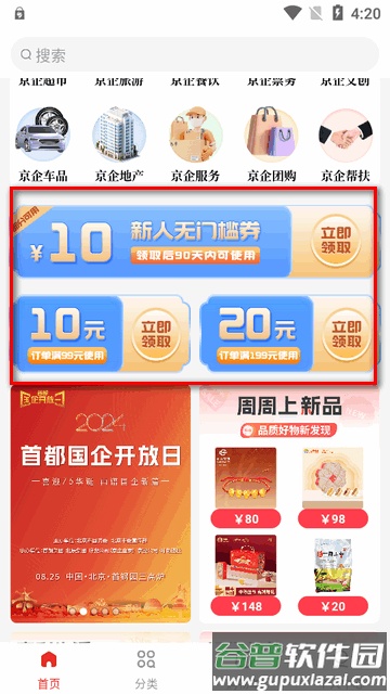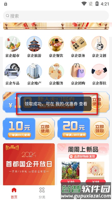 2、打开软件,在应用首页通常可见优惠券入口,点击“立即领取”。