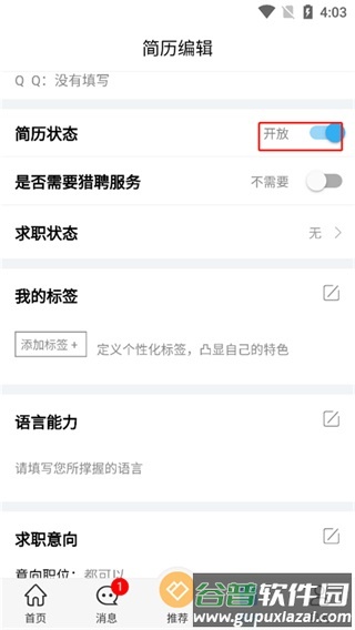 2、在简历状态设置中点击关闭选项,即可完成简历隐藏。