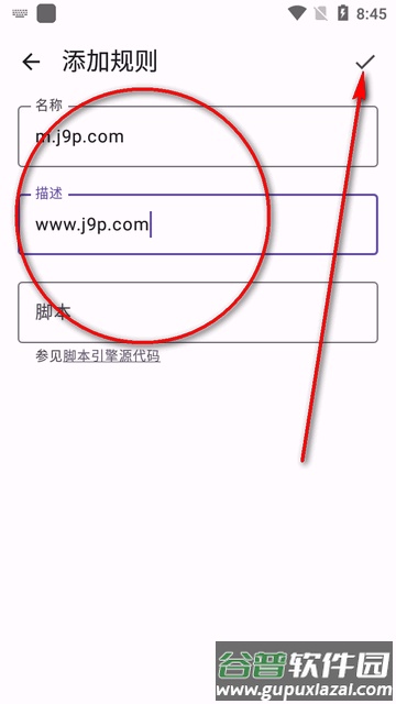 2、进入添加规则界面,填写规则名称、描述和对应的处理脚本,点击右上角对号保存;