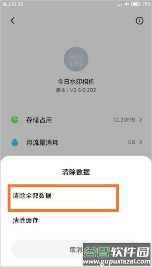 1. 先将手机切换至飞行模式,进入设置选择“应用设置”,打开“应用管理”,找到“今日水印相机”并点击“清除全部数据”。