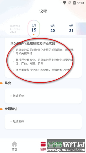 4、议程页面能够查询每日的峰会安排与专题演讲信息。