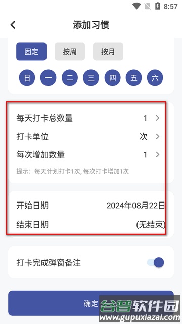 4、设定打卡的周期与次数要求,点击确认完成创建。