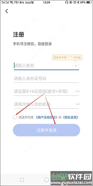 填写姓名、身份证号码,设置登录密码,点击【注册并登录】。