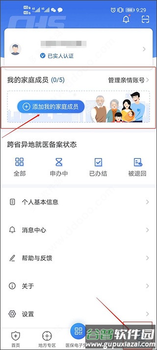 第三步:点击底部菜单栏【我的】进入个人中心,在【我的家庭成员】区域点击“+”图标添加亲情账户;依据页面指引上传资料并完善信息。