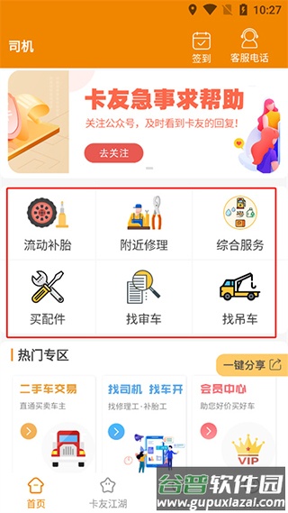 【主页】:集合流动补胎、附近修理、配件采购、综合服务、审车办理、吊车寻找六类服务,迅速应对运输途中各类状况;提供二手车交易功能,协助用户以更优价格买卖车辆;开设招聘求职板块,缓解司机找活、雇主招人的难题;