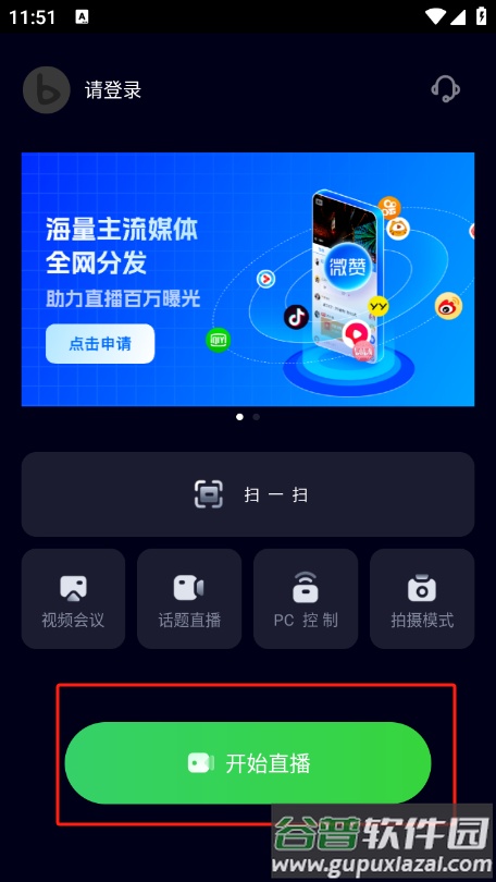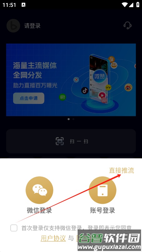 3、接着选择直接推流模式,用户也可登录账号以保存推流设置;