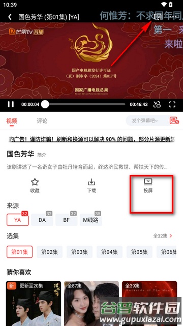 2、进入视频播放页面,点击右上角的TV图标,或者使用界面底部的TV投屏按钮。