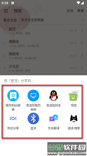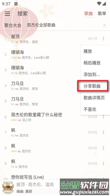 3、在搜索结果中,点击歌曲右侧的三个点,选择分享选项。