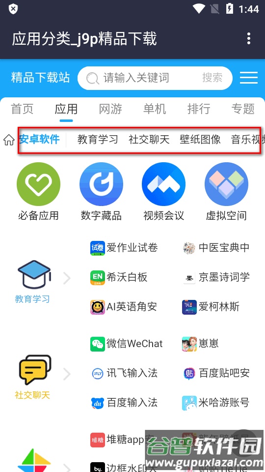 3、进入应用分类页面,上下滑动可浏览不同软件类别。