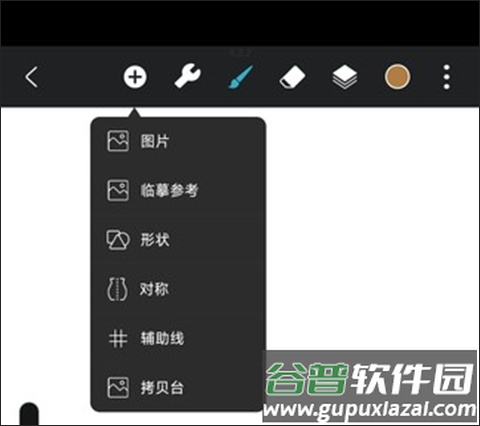 1、新建画布后,点击上方加号图标,弹出功能菜单栏;