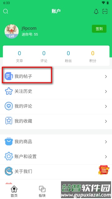 4. 注册并登录成功后,点击“我的贴子”选项。