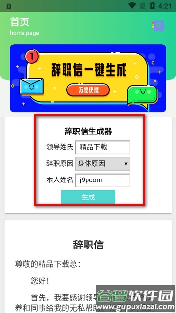 3、完成设置后点击生成按钮,系统便会快速输出辞职信内容。