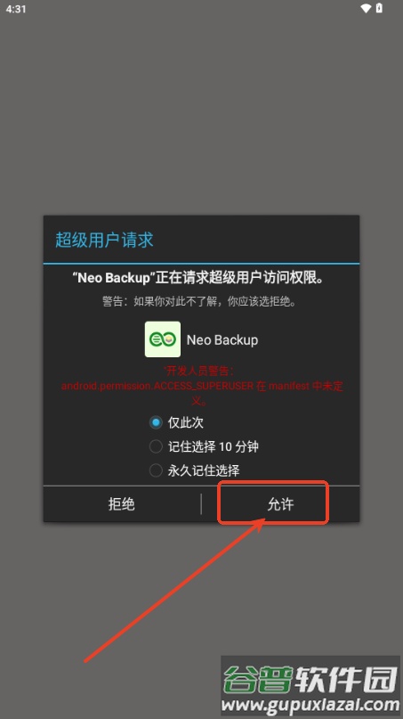 7、授予存储空间访问权限,此权限使软件能够读写外部存储,从而备份其他应用的外部数据。