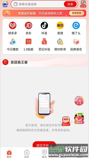 2. 购物返利服务:在平台首页通过拼多多、抖音、京东或美团等渠道购物,均可获得相应比例返利;返利金额每月二十六日后可在个人页面提现。
