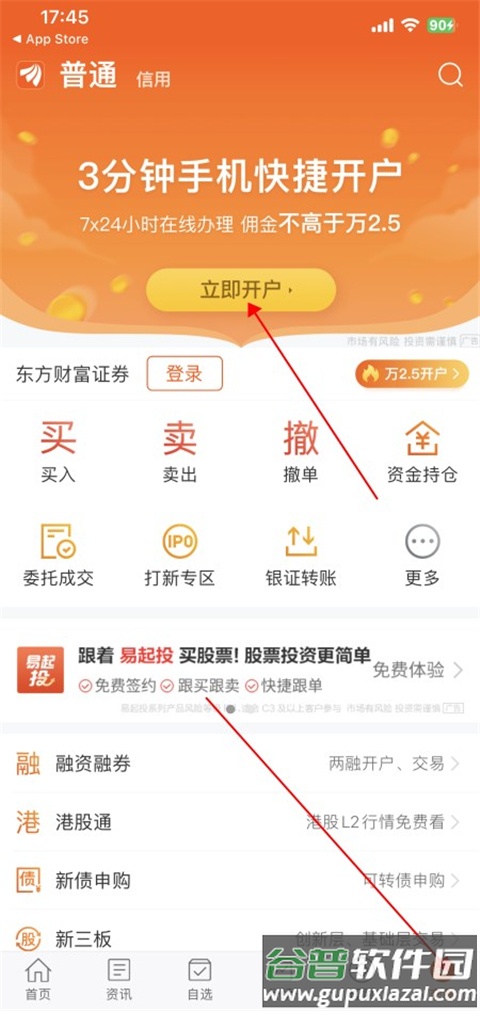 2、下载安装东方财富证券app,进入行情页面点击立即开户。
