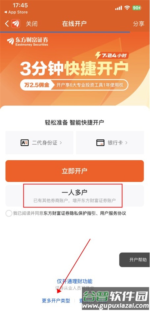 3、根据个人情况选择立即开户或一人多户,也可查看开户类型说明。