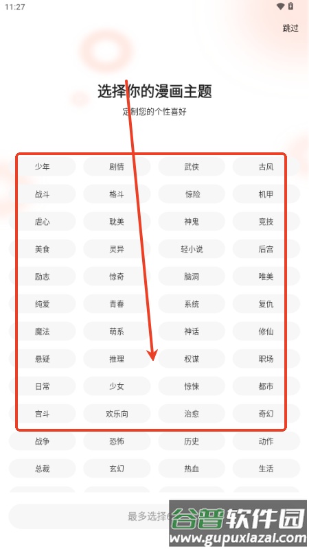 3、然后挑选你喜欢的漫画主题类型,最多可以选择六个;