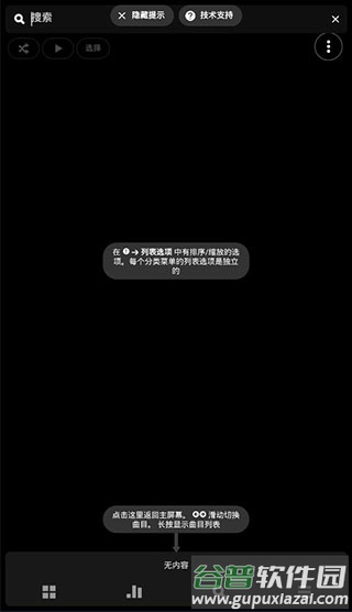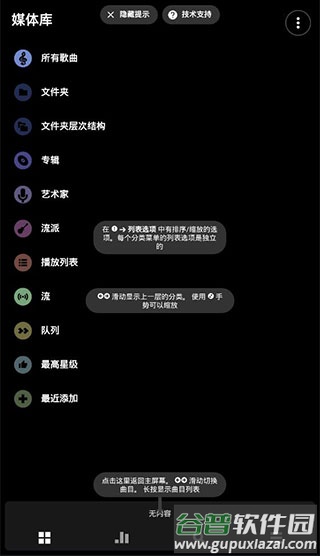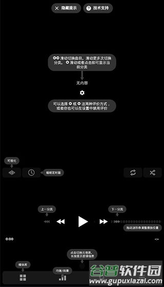 1、主界面支持滑动手势切换歌曲,多次滑动可切换不同分类,点击或滑动也能显示当前分类信息。