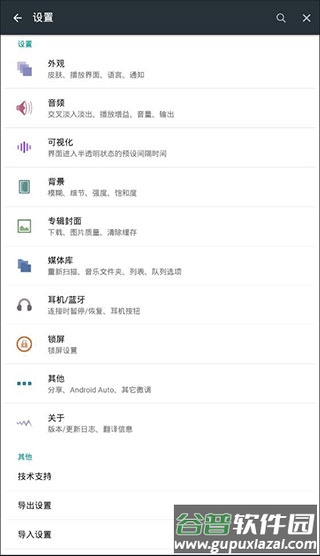 5、设置页面允许自定义多项参数,包括外观、音频、可视化效果、背景、专辑封面、媒体库、耳机蓝牙、锁屏等。