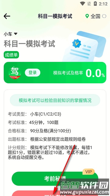 5. 在模拟考试界面点击开始按钮即可进行测试。