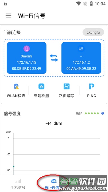 2、WiFi信号:实时检测无线信号强度,查看网络详情如信号强度、MAC地址、信道、IP配置、连接速率;分析WiFi信号质量与信道分布,进行安全性评估。