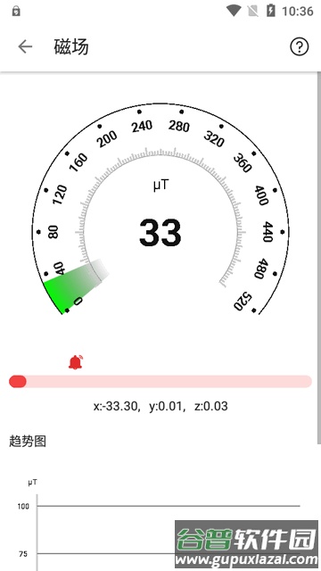 5、切换到磁场检测页面,能够读取设备周围的磁场强度及相关数据。