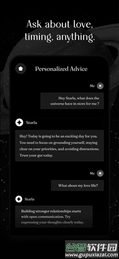 提供多样互动方式:生活中遇到的感情问题、职业发展或情绪困扰都可以向Starla提问,它会依据星盘信息给予回应;专门设有“浪漫建议”板块,用于探讨亲密关系话题;“语音聊天”界面则支持直接语音对话,营造出一种倾诉与聆听的陪伴感,增强了情感层面的互动。