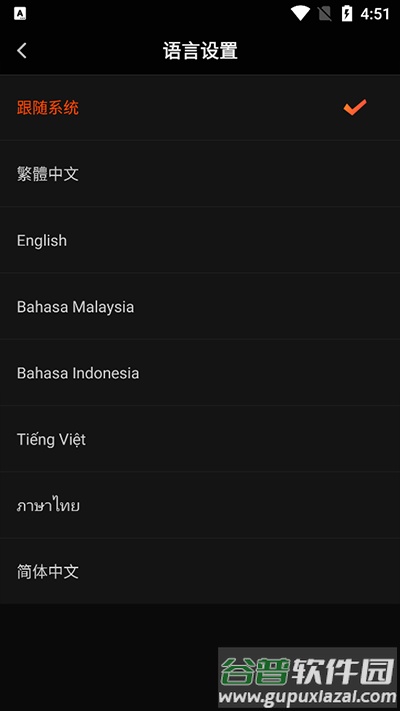 3、在【语言设置】页面中,根据个人需要选择语言:繁体中文、英语、泰语、越南语、马来西亚语、印尼语。