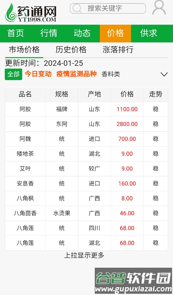 4、点击价格板块,能够查询各地市场各类药材的具体报价信息。