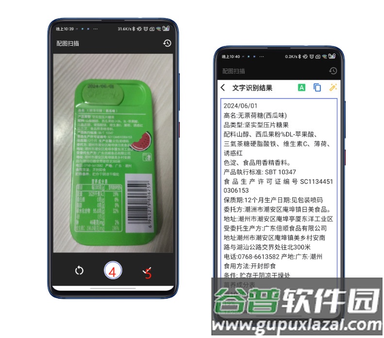 点击4进行拍照,随后点击5启动文字识别;识别完成后界面将显示类似右图的文本结果。