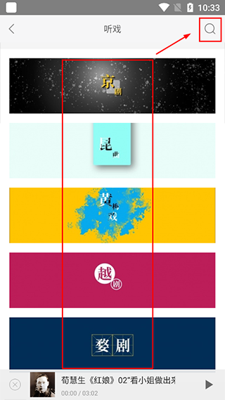 2、若有明确想听的剧目,可直接搜索查找;若无,也可从下方喜爱的剧种分类中进入挑选;