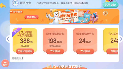会员选项包括:永久识字包加永久阅读包组合售价388元;识字加阅读年卡198元;永久识字包248元;另有月卡24元,季卡68元。从长期使用角度看,永久组合包性价比较高。