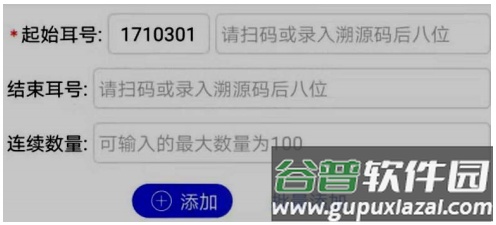 批量添加需确保耳标号为连号,点击批量添加按钮后,输入起始与结束耳号的后八位,或输入起始耳号及连续数量即可添加;单次批量添加上限为100个,即一包的数量。