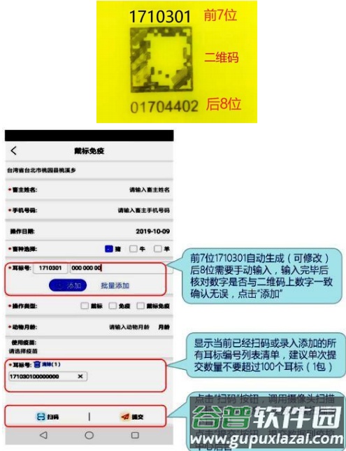依次填写并确认畜主姓名、手机号码、畜种、动物月龄、使用疫苗等信息,录入15位牲畜耳标号后点击提交即可完成操作。