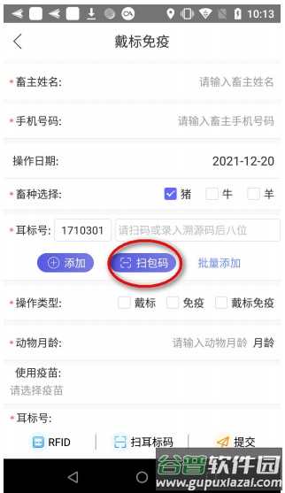 通过扫包码功能扫描二次发放包号,可获取包内所有耳标号,并从中选择需进行戴标免疫的耳标。