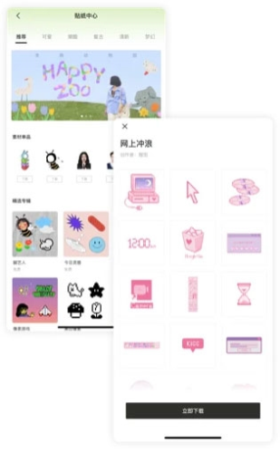 3、贴纸中心:用户可在此随时下载最新素材;若缺乏灵感,可浏览“推荐”中的拼贴作品,并能一键下载作品内全部贴纸,创作属于自己的涂鸦或网络风格图片。