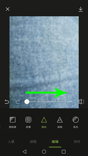 4、进入锐化设置界面,向右拖动调节滑块,增加锐化效果,从而使照片变得更加清晰。