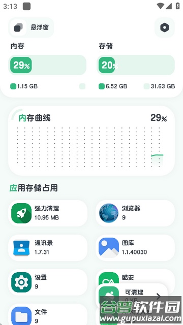 清理效果明显,体积小巧,能有效清理存储空间与运行内存,同时监控CPU状态。