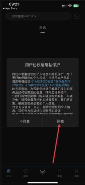 1、启动ARCFOX应用,在登录页输入手机号,点击获取验证码,填写验证码后勾选用户协议,点击登录并按提示同意相关隐私条款。