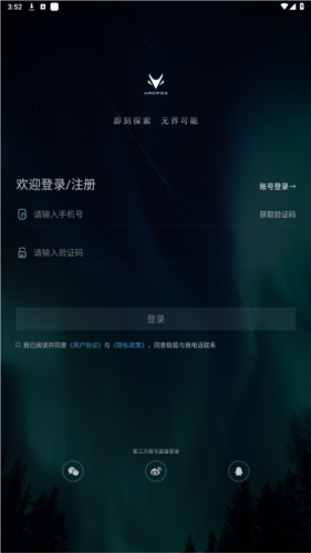 1、打开ARCFOX极狐应用,在登录或注册页面输入手机号码及收到的验证码;