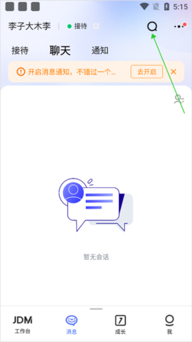 1、打开并登录京东咚咚应用,进入消息页面,点击搜索图标(下图绿色箭头所指位置)。
