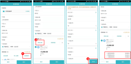 针对多部门、多项目或产品线共同产生的费用,可按比例或金额进行分摊。在报销单内选择 ①【批量管理】,点击 ②【费用分摊】,填写分摊信息后选择 ③【确定】。分摊完成后,在消费明细下方即可查看分摊结果。