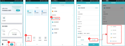 操作步骤:点击首页 ①【+】号按钮,选择 ②【新建单据】,然后选取适用的 ③【报销单】模板并填写信息。可通过 ④【导入明细】功能快速导入发票数据,系统会同步验证开票信息是否准确。