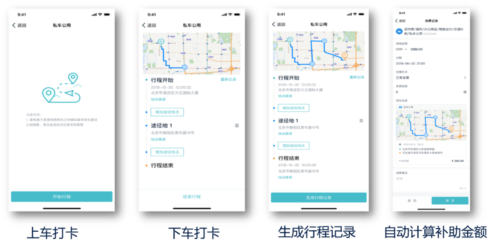 在首页进入“私车公用”模块,点击“开始行程”按钮启动记录,行程结束后点击“结束行程”,系统将自动生成行车记录。依据公司制度,软件可自动计算并生成补助金额,完成整个行车报销流程。