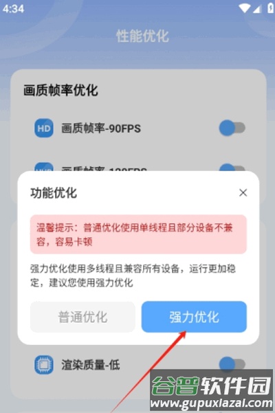 接着在优化模式中挑选,通常推荐使用强力优化模式以获得更好效果。