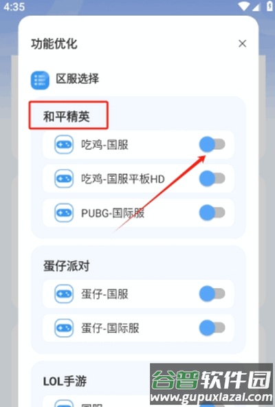 然后选定你要优化的游戏及其服务器,这里以和平精英作为示例。