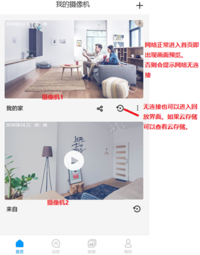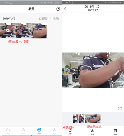 在回放录像时,点击“照相机”或“摄像机”图标,可将当前图片或视频片段保存下来。在app主界面点击“相册”,即可找到已保存的图片或视频文件。