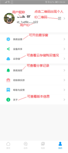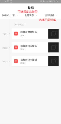 点击“动态”进入动态列表,选择“全部动态”后,可按移动报警或视频通话等类型进行筛选。点击“全部设备”可切换查看不同设备产生的动态。动态信息保存在服务器上,用户无法自行删除。