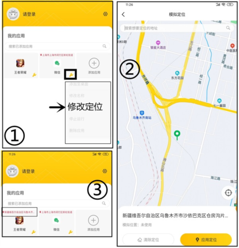 3、点击王者荣耀旁的工具图标,在下拉选项中选择【修改定位】功能。在地图界面搜索目标区域,建议选择玩家较少的地区,然后点击【应用定位】。返回首页即可看到王者荣耀图标上显示新定位,至此定位修改完成。