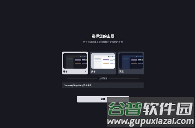 根据偏好选择界面主题,可选方案包括暗色、亮色与深蓝。接着选择显示语言,支持简体中文或英文。这些设置后续均可在设置中心调整。完成后点击“继续”。